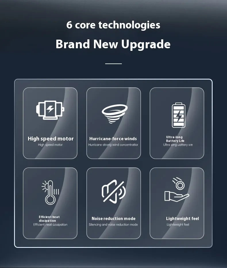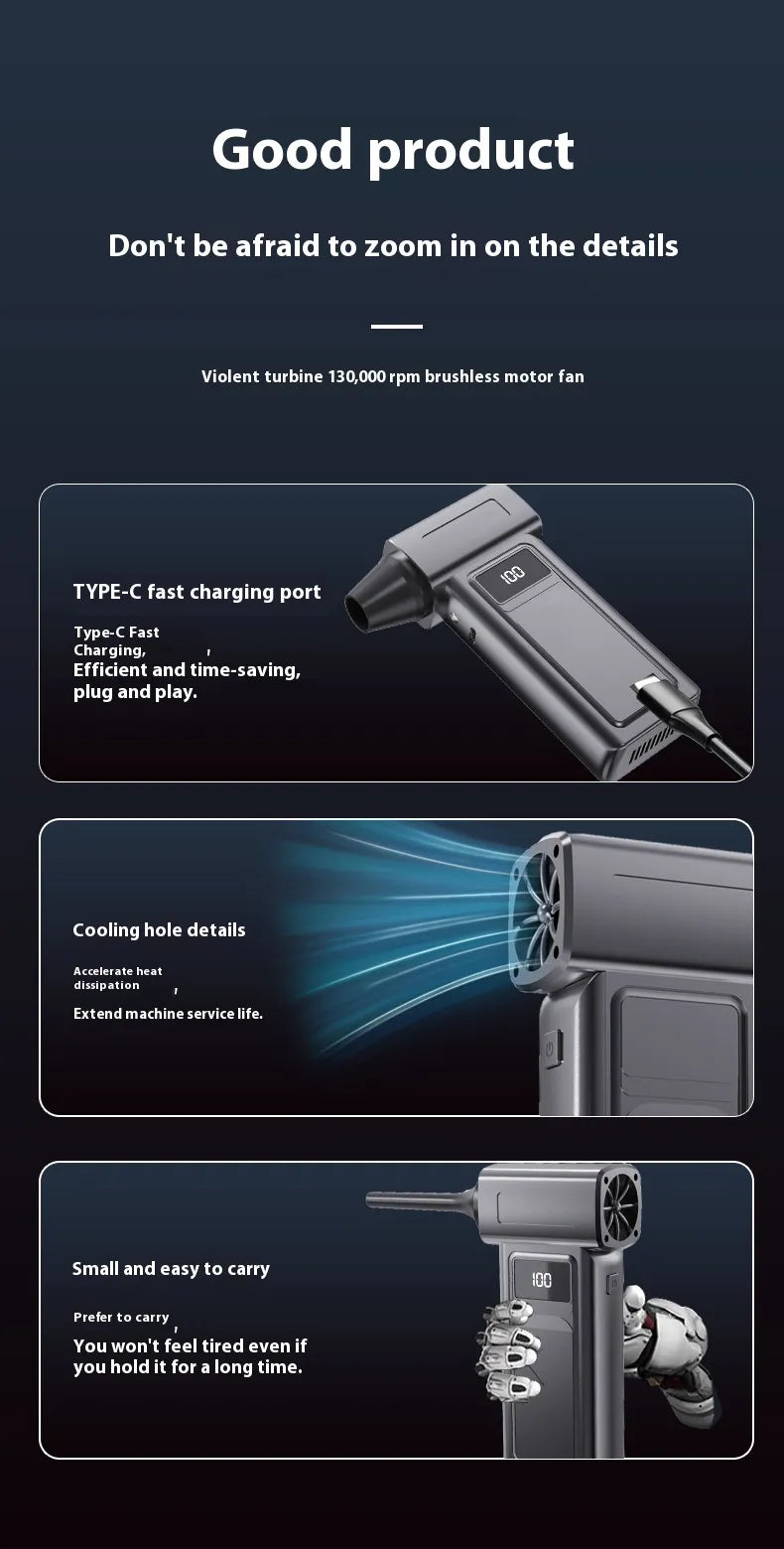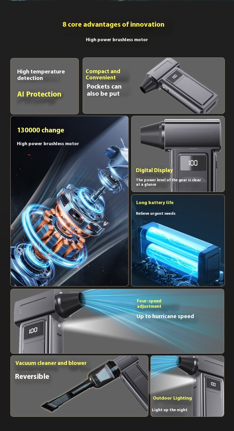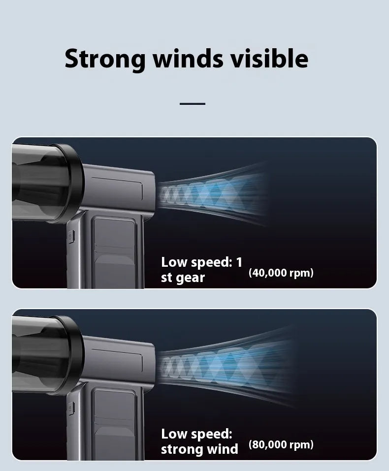 Kraftfull 130000 RPM AirBlower med LED-belysning, digital display och borstlös motor för maximal precision och styrka. Kompakt, tyst och perfekt för bil, hem och elektronik.